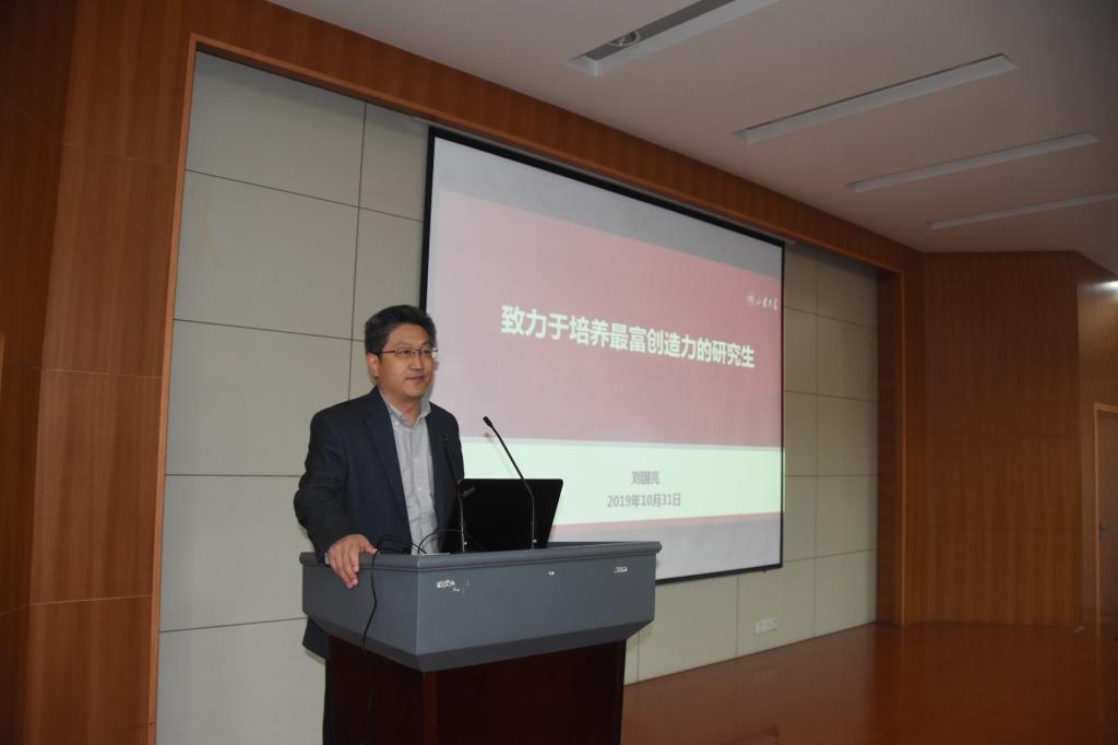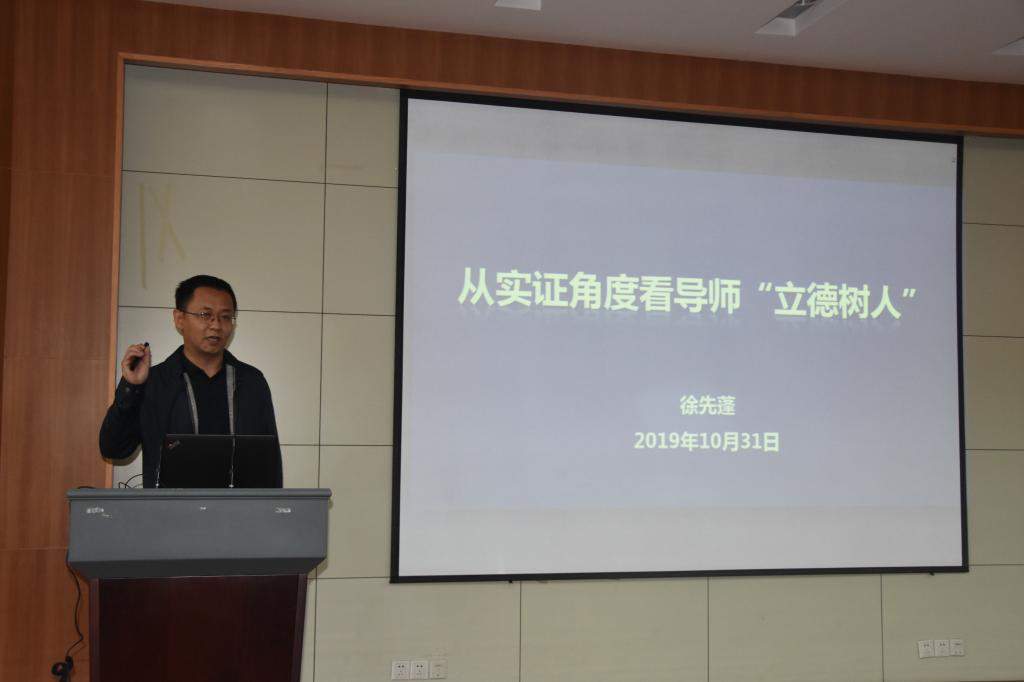 会上研究生院常务副院长刘国亮教授以“致力于培养最富创造力的研究生”为题,从“研究生教育进入新时代、培养最富创造力的研究生、研究生教育综合改革”三个方面介绍了研究生教育在新时代宏观大背景下面临的机遇以及十四次党代会提出的新要求,培养最富创造力研究生的目标任务和框架,以及beat365英国官方网站研究生教育综合改革实施路径。清华大学电机工程与应用电子技术系博士生导师、电力系统国家重点实验室副主任、IEEE Fellow赵争鸣教授以“导师是学生的平台、伯乐和引导者”为题,结合自身培养博士研究生经历的“项目牵引、问题牵引、前沿牵引”三个阶段,从哲学高度思考博士研究生教育对博士生和培养导师的条件要求,并从“胸有大志、海阔天空;独立思考、有所创造;成于专注、行于坚韧”三个方面,期待导师与研究生共同成长。学位办徐先蓬主任以“从实证角度看导师‘立德树人’”为题,结合案例,从正反两个方面分析研究生立德树人过程中存在的问题,并通过数据说明研究生培养短板,指明改进方向。