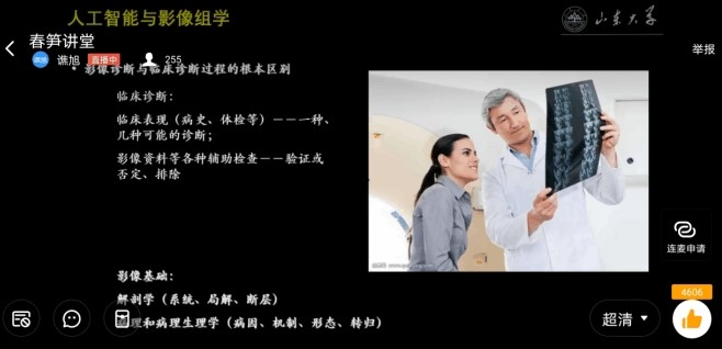 下半场主题为“基于医学影像的智能识别与辅助诊断的研究与展望”,谯旭老师以准确简要的概念描述以及对检测对象的介绍让同学们对种类繁多的医疗信息图像检测方式和手段有了初步了解,并且指出目前医生面临的图像数据处理起来难、缓的问题,重点介绍了为解决这个问题应运而生的计算机辅助诊断(CAD)方式、人工智能和影像组学等发展方向,和王新沛老师一同表达了自己对控院学子未来在该领域有所作为的殷切期望。