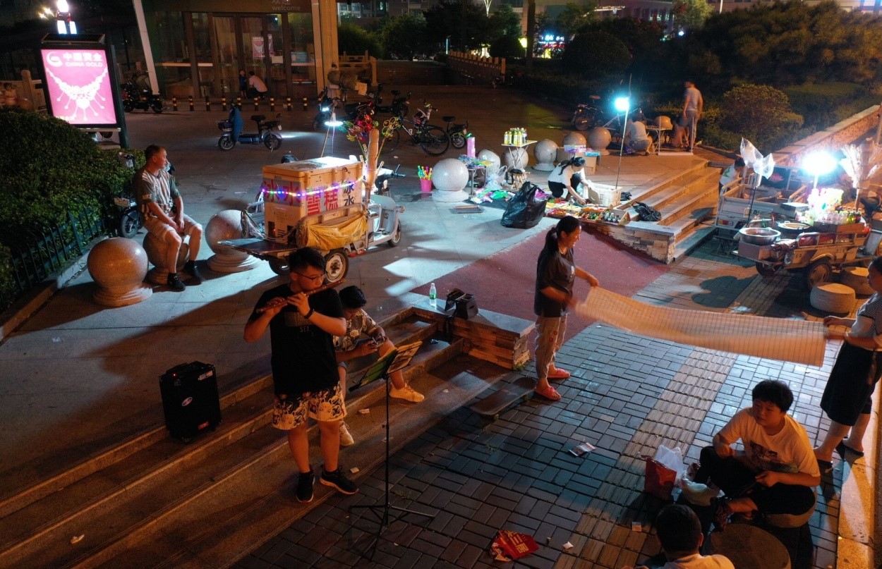 晚7时,调研团成员联系无人机航拍同行人员,并带上谱架、音响等艺术展示设备,准备前往进行调研。在开展艺术展示前,调研团成员前往三个夜市地点进行走访调查,分别是东皋公园前街、地下广场及刘南宅美食街。通过走访调查发现,沂水县地摊经济发展相对不成熟,只有刘南宅商业区有相对固定的摊点、成熟的经营管理方式以及稳定的客流量;而地下广场及东皋公园前街地摊则常受天气影响,出摊率较低,其中东皋公园前街则因管理及环境问题面临着被取缔的风险。收集完基本信息后,调研团成员选定于客流量适中且不影响交通及其他摊点正常贸易的地下广场夜市处进行艺术展示。