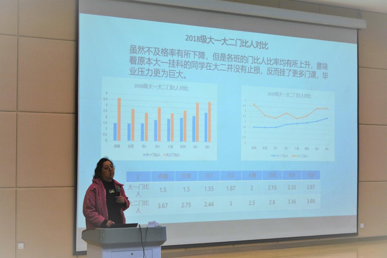 晚上20时,大会正式开始。首先,刘慧慧就2018级学习情况、宿舍卫生情况及拓展培养工作开展情况进行了总结。学习方面,全年级百分制绩点整体较上一学年相比有所提升,其中人工智能与机器人班及自动化三班提升相对较大。尽管年级不及格问题、未达到毕业要求问题有所改善,但状况仍不乐观。由此,希望同学们能静下心,仔细分析自身情况做好下一步规划。而在宿舍卫生方面,刘老师表彰了21个优秀宿舍,进一步强调同学们一定按照学校规定,保持宿舍环境干净整洁。接下来,刘老师指出在两年不断完善实践过程中,学院多举措稳步推进拓展培养工作,2018级本科生两年基础要求完成度均在97%以上,“3+4+3”模式的拓培计划完成度有了大幅度的提高,成效良好。