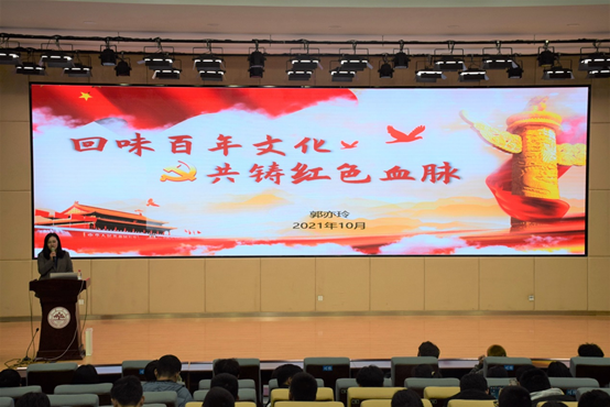 讲座以短小视频再现历史、诗词画卷抒情言志、红色歌曲滋养精神为主线,带领同学们感受中国共产党筚路蓝缕的百年征程,深刻体会红色文化和红色精神在新时代的强大生命力。讲座以影视作品《觉醒年代》片段引入,再现了1915年至1921年之间新文化运动、五四爱国运动、中国共产党创立的波澜壮阔历史,生动讲述了共产党人矢志不渝的历史初心,党史故事与受众心理产生同频共振。读经典诗词,品“中国精神”,郭亦玲带领同学们赏析了毛泽东诗词《沁园春·雪》、《七律·长征》等,充分领略中国古典诗词的艺术魅力,陶冶情操,丰富生活,提高鉴赏能力,同时鼓励学生拥有积极向上的人生态度、开阔的视野和宽广的胸襟。《中国人民志愿军战歌》一字一音,铿锵有力,使人联想到抗美援朝时中国人民志愿军跨过鸭绿江的坚定步伐,给人以正义凛然、无所畏惧的艺术效果,表达中国人民保家卫国的壮志雄心和英雄气概。讲座期间,郭亦玲场与同学们展开互动,大家积极,氛围活跃。最后,全体同学齐唱《没有共产党就没有新中国》,声音嘹亮,激情飞扬,在振奋人心的歌词中坚定跟党走的信念,在传唱中激发奋斗的热情。