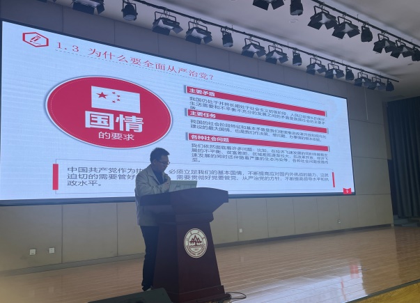 马雁思结合中国共产党第二十次全国代表大会的报告精神,为大家梳理了全面从严治党的背景原因和历史沿革等有关内容,从全面从严治党精神解读、重大意义、战略部署以及要求落实这四个方面展开讲解。他指出,全面从严治党是马克思主义建党学说的重要原则,也是习近平新时代中国特色社会主义思想的重要组成部分。随后,马雁思介绍,全面从严治党落实落地,需要全体党员牢记“四个意识”,践行“四讲四有”,做到“四个合格”,铭记习近平总书记提出的“三个决不能”。最后,他提出了对同学们的殷切希望,作为青年人,要勇担时代使命,自觉在思想上、政治上、行动上向党组织靠拢。