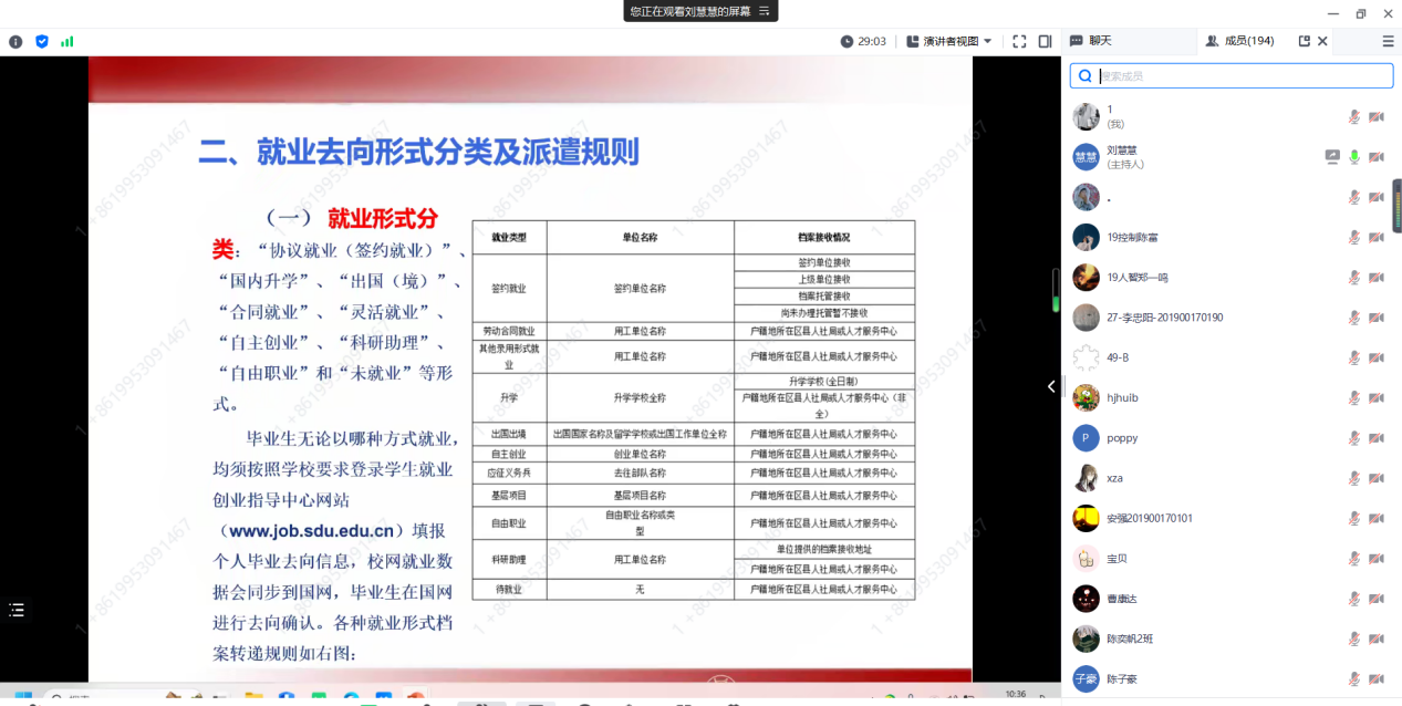 首先,刘慧慧向各位2023届毕业生表达祝贺与期望,并传达了2023届毕业生毕业离校有关事宜。随后,刘慧慧为各位毕业生开展毕业季教育,分别从理想信念、廉洁诚信、担当奋斗、科学精神等方面引导毕业生正确认识远大抱负和脚踏实地,加强毕业生理想信念教育,激发毕业生爱校荣校之情、感恩奉献之心和奋斗报国之志,培养毕业生勇于担当的责任感和使命感,最后,刘慧慧介绍了就业材料、户口和档案的相关事宜,提醒毕业生按照不同就业类型上交相应就业材料,并对档案去向、户口迁移、诚信还贷、高等学校毕业生学费和国家助学贷款等相关政策进行了讲解,同时,刘慧慧鼓励未就业学生调整就业心态,主动寻求就业机遇,实现尽早就业。