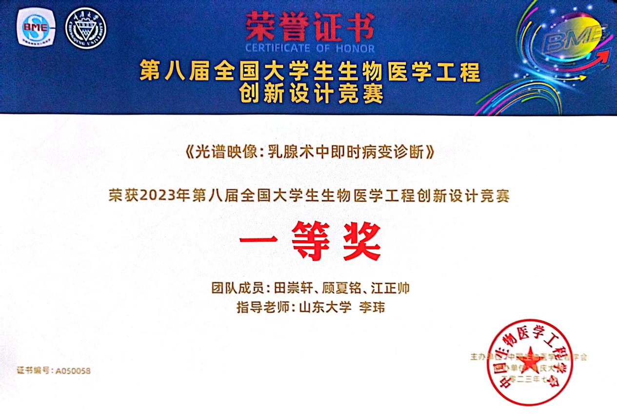 1.参赛作品“光谱映像:乳腺术中即时病变诊断”(指导教师:李玮;参赛队员:田崇轩、顾夏铭、江正帅)获一等奖