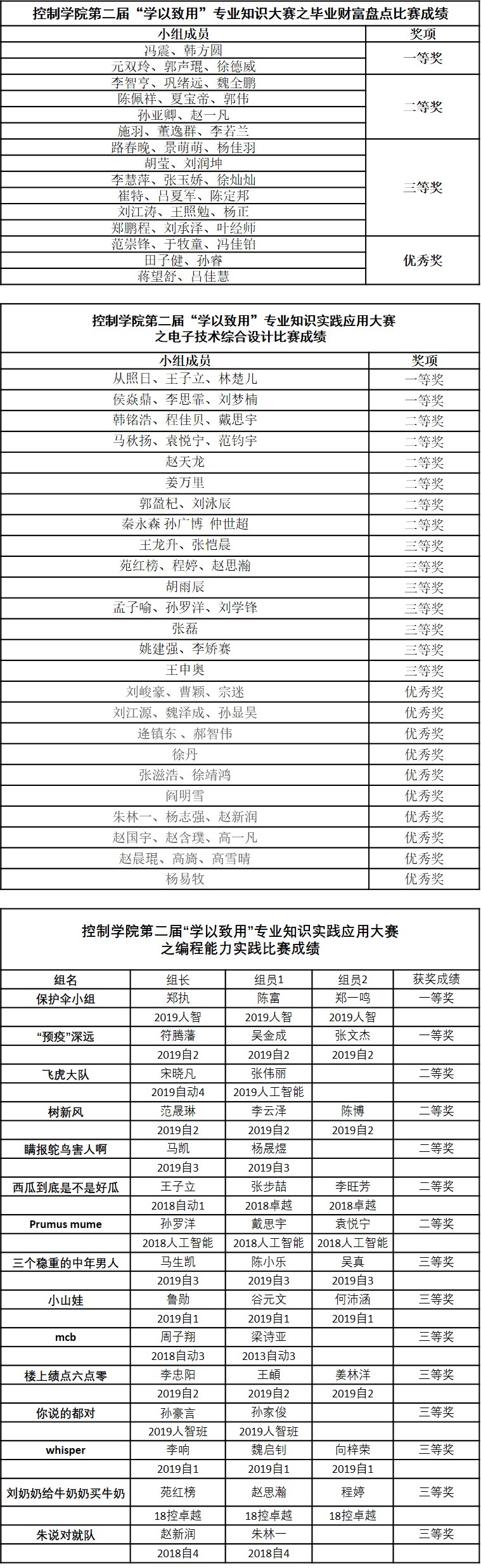 为了积极响应教育部及beat365英国官方网站疫情期间“停课不停学”的政策号召,深化教育教学综合改革,加强新工科建设,落实学校拓展培养计划,全面提升学生创新实践能力,同时分阶段检验学生专业知识的运用,拓宽专业知识面,经过beat365党委决定,beat365团委于3-6月在大四、大一、大二年级本科生中开展了第二届“学以致用”专业知识实践应用大赛之毕业财富大盘点、C语言编程能力实践比赛以及电子技术综合设计比赛。三个比赛以课本知识为基础,让学生完成对所学知识融合、提高、升华,重点考核学生对所学理论的深度理解、融会贯通、灵活运用能力,比赛过程作为各年级专业课程考核的一部分,“以赛促学,以赛促练,奋勇争先,相互切磋,共同提高”,进一步提高学生理论与实践相结合的意识与能力。经过激烈角逐,初赛完成度高、参赛热情度高,较好地达到了比赛目的。现将三个比赛的成绩公示如下: