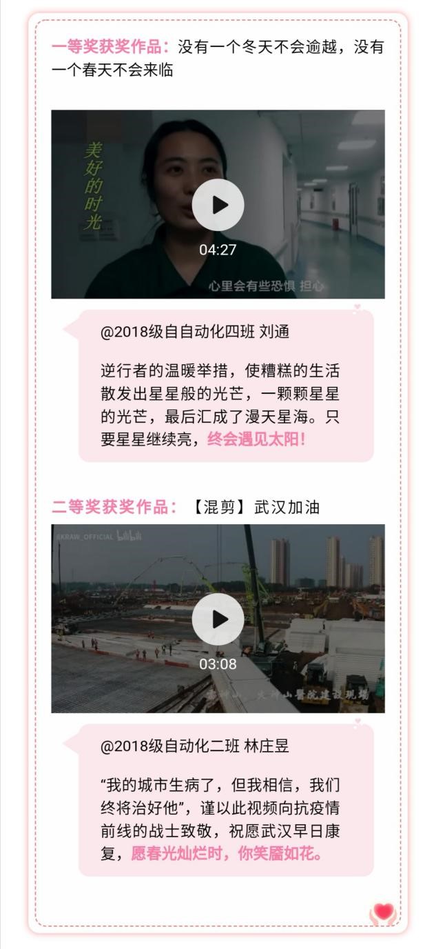 除了海报制作活动,beat365学生工作委员会也积极响应团委号召,面向全体控院学生举办了视频制作比赛,通过视频的方式传递人文关怀,传播社会正能量。其中,以《没有一个冬天不会逾越,没有一个春天不会来临》为代表的五份作品以其中传达的凝聚力和希望脱颖而出。其他视频作品也饱含深情,充分体现了疫情面前中华儿女紧密团结的浓厚情谊,展现了控院学子在疫情防控期间积极向上、昂首向前的精神风貌,表达了控院人对一线工作者的关切和对疫区人民的牵挂之情。
