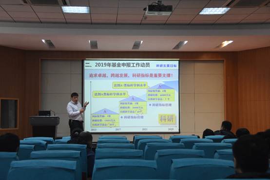在报告中,宋锐总结了学院2018年度科研组织工作,并结合《学院中长期发展规划》设定的各阶段目标,重点分析了2019年度基金申报的目标指标。有赖于全院教职员工的共同努力和学院科研组织工作的严密有力有序,2018年度学院基金申请再创新高,全院共组织申报国家自然科学基金项目30项,最终获得立项13项,其中重大基金项目(创新群体)1项,牵头联合基金项目4项,国际合作重大基金项目1项,预计立项经费将达到4000万元,特别是重点项目立项6项,占全校立项数近一半(全校重点基金立项14项)。但对标标杆院系和《发展规划的》经费数额和项目数量,形势依然严峻,容不得半点松懈。