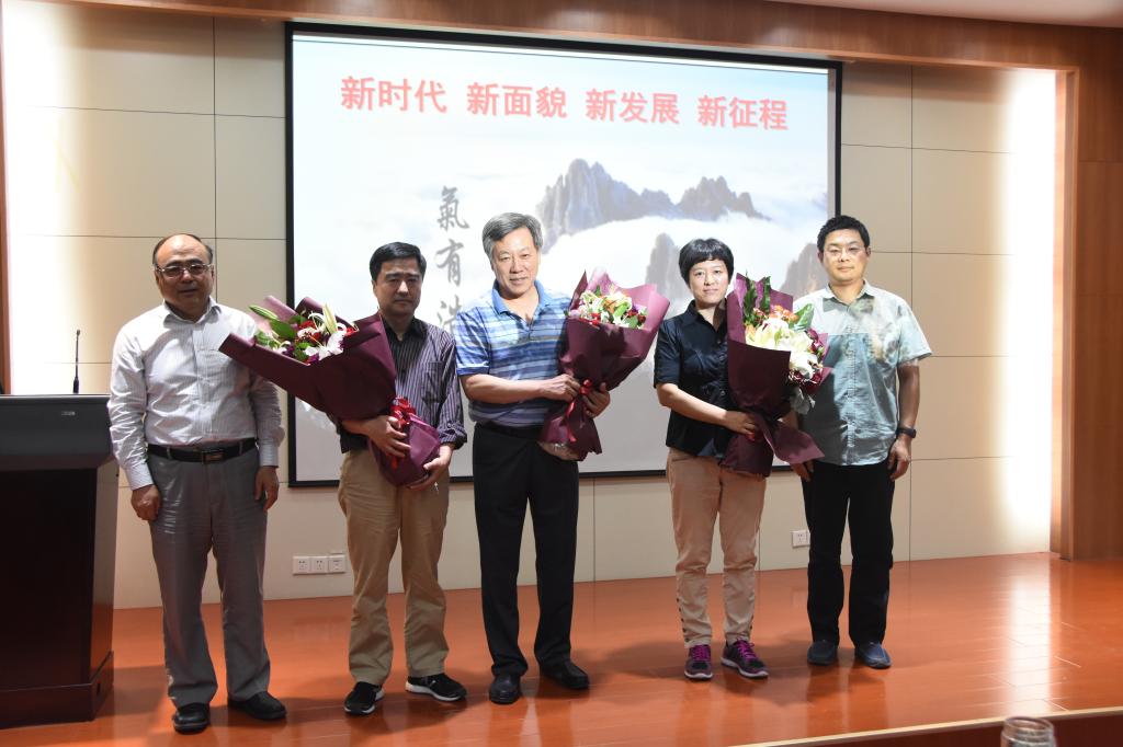 会上,张承慧介绍新入职教工和新一届管理服务团队,并向上一届领导致谢,并向到场的三位同志献花致意。