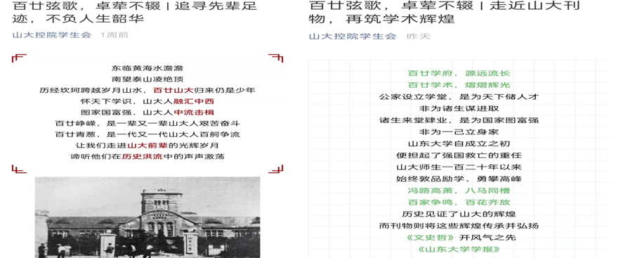 妙笔生花,共享人文精华。为创新美育形式,beat365以山大控院学生会公众号为载体,开设了“百廿弦歌,卓荦不辍”、“控山心语home”、“兴隆山下”等线上美育版块,搭建更多更好的自我学习平台,以文字形式普及人文艺术等美育知识,在理工氛围浓厚的兴隆山不忘提升人文素养,激发和满足工科学生的兴趣。紧跟时事,推出百廿专题等栏目,进一步宣扬校史、党史知识,培养同学们的爱党、爱国、爱校情怀。线上线下并举,取得显著成效。