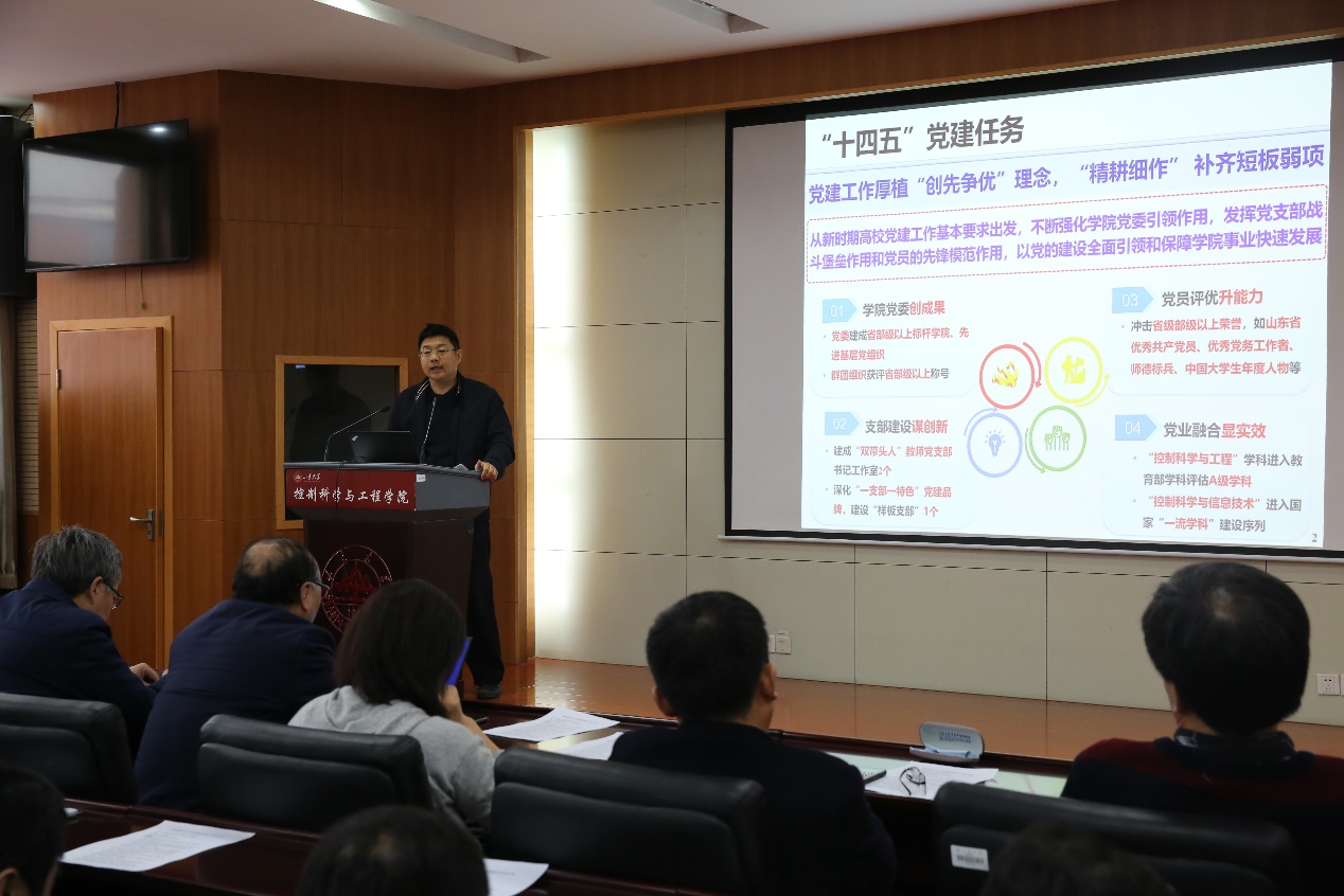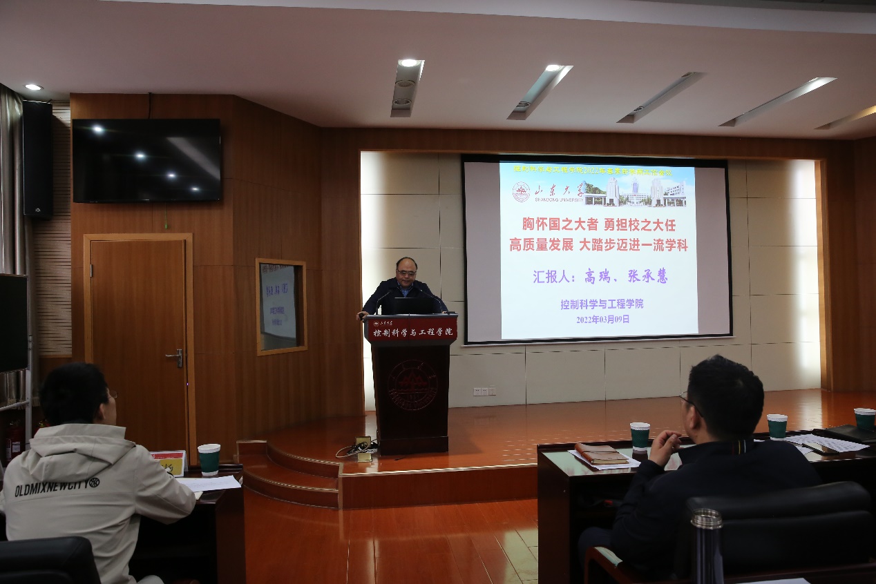 院长张承慧以“胸怀‘国之大者’,勇担校之大任,高质量发展,大踏步迈进一流学科”为题的工作报告。报告分为“十三五”工作总结、对标一流学科寻找差距、“十四五”一流学科建设任务、高质量快速发展路径等四个部分,重点阐述了学院十四五学科规划和一流学科建设工作。