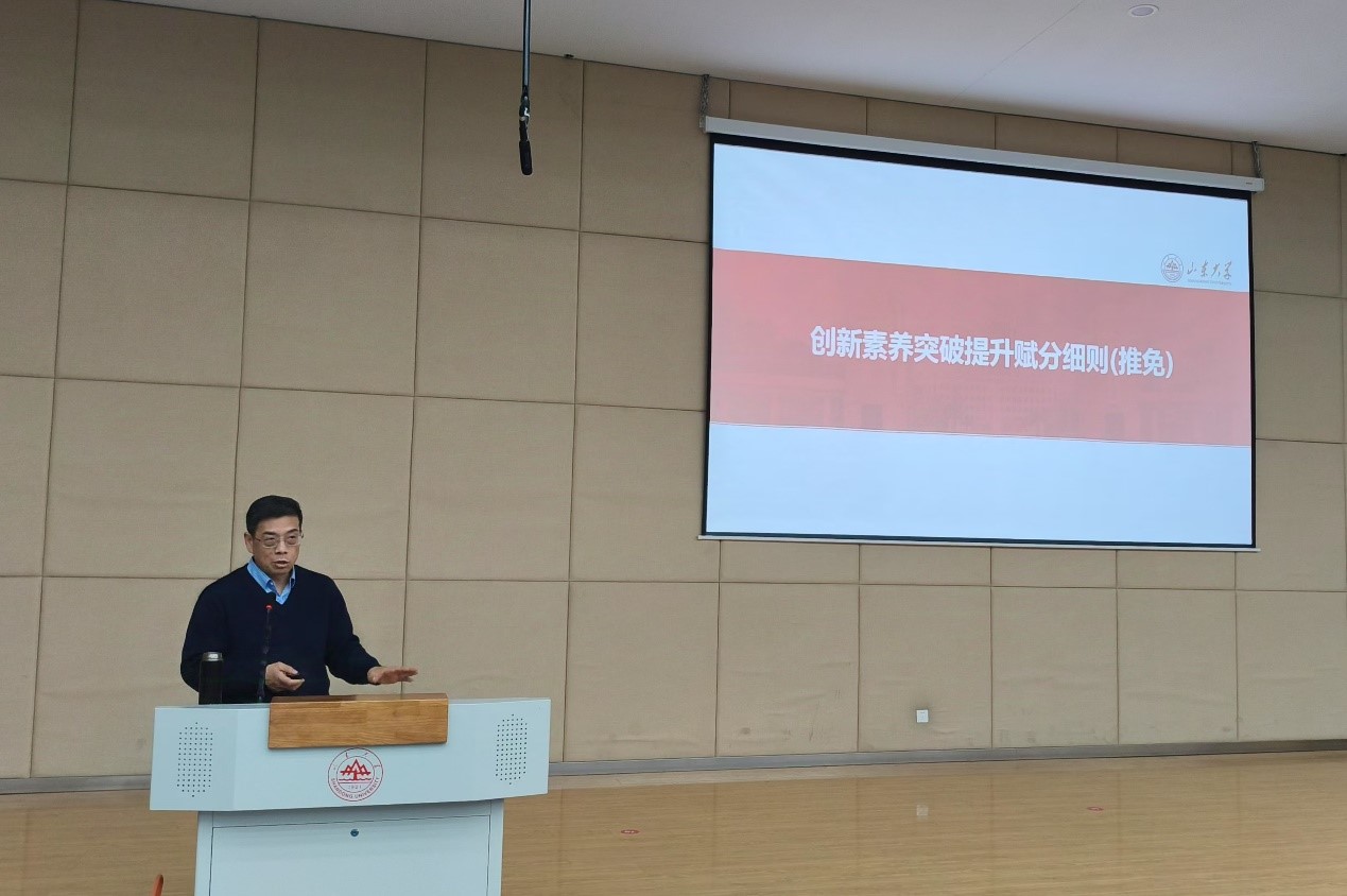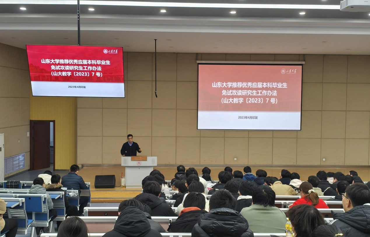 朱文兴结合习近平新时代中国特色社会主义思想以及新时代教育评价改革精神和立德树人根本任务,全面深入解读了《beat365英国官方网站推荐优秀应届本科毕业生免试攻读研究生工作办法(山大教字〔2023〕7号)》,重点说明了推免排名方法、推免资格要求、推免生名额计划分配、推荐办法等学生高度关注的核心条款,并对下一届优秀毕业生推免遴选阶段的工作流程和大致时间节点做了相关介绍。他强调,各位同学一定要熟悉课程属性,认真核对专业培养方案与教务系统教学执行计划,提前做好自身学习规划,切实保障学业成绩满足和达到修读要求。