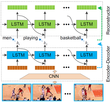 该论文提出了一种新的用于视频描述(video captioning)的“编码器-解码器-重构器”深度模型,简称RecNet。该模型可以充分挖掘视频内容与文字描述之间的双向信息,所提出的重构器融合策略可以在全局层面和局部层面同时重构视频片段特征,从而首次实现了视频特征和自然语言的双向映射。RecNet模型在多个国际公认的大规模视频语义描述数据集上,都取得了目前最好的测试结果。