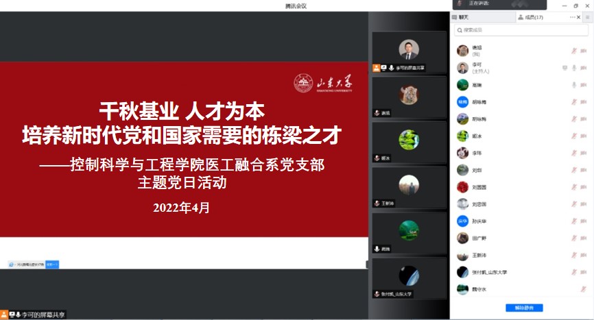 随后,医工融合系党支部委员谯旭领学了beat365英国官方网站新冠肺炎疫情应急处置工作指挥部《关于进一步做好校园突发新冠肺炎疫情应急响应的工作措施》和《教育部、财政部、国家发展改革委联合召开新一轮“双一流”建设推进会》等文件。医工融合系党支部委员王新沛领学了《教育部长怀进鹏调研北京大学、清华大学:全面加强基础学科拔尖人才培养》文件要点,并解读了《beat365英国官方网站“师生一家亲”互动小组行动方案》。随后,支部教师们对疫情防控和核酸检测、应对疫情网格化管理制度、“师生一家亲”互动小组行动细则、线上教学材料的完善、生物医学工程专业国际化、本科毕业设计中期考核、硕士学位论文盲审等工作进行了讨论。